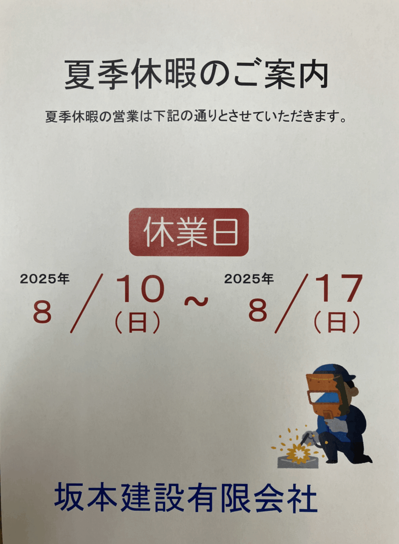 誠に勝手ながら、坂本建設有限会社では8/10(土)~8/17(日)までを