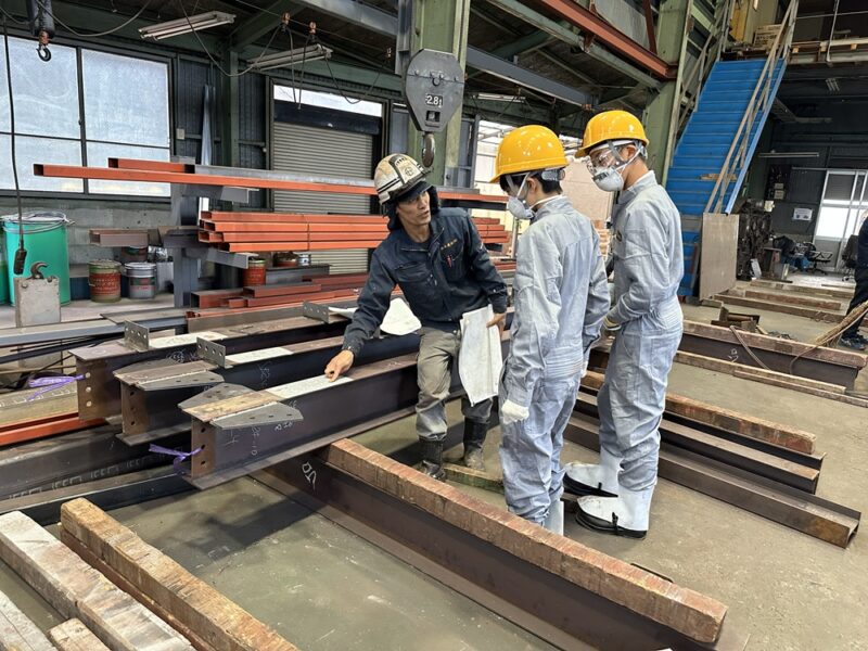 安全のため少し離れた場所から見学をし、鉄骨を組み立てる工程を見学してもらいました。